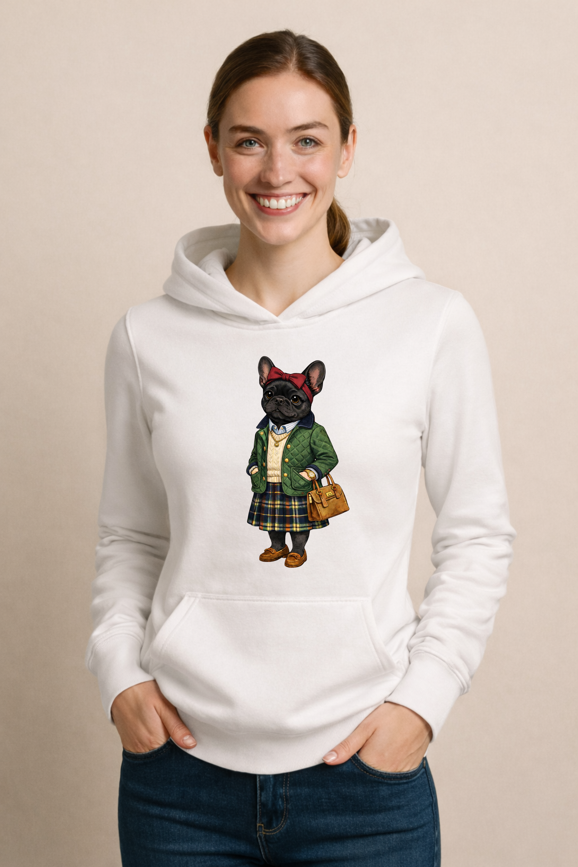 Elevate your casual wardrobe with a touch of classic charm. The Preppy Black French Bulldog hoodie features a refined illustration of a golden retriever dressed in timeless collegiate style—complete with blazer, cable-knit sweater, scarf, and loafers. It’s the perfect blend of playful personality and polished prep.